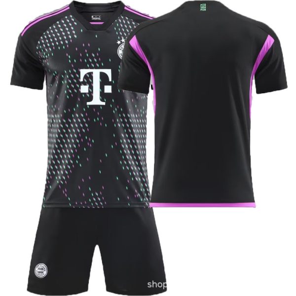 Das Adidas Bayern München 23-24 Auswärtstrikot hat eine ungewöhnliche Farbkombination für den bayerischen Verein – es kombiniert eine schwarze Grundfarbe mit Grün und Lila.Die Drei Streifen sind lila, während die Logos auf der Vorderseite hellgrün sind. Auch die Namen und Nummern sind lila.Ein modernes Muster in Lila und Grün, das aus den traditionellen Rauten des Vereins besteht, rundet den modernen Look ab.