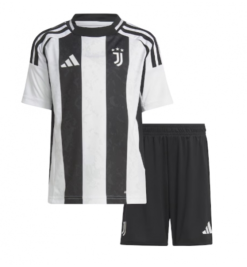 Das neue Juventus 2024-25 Trikot ist traditionell weiß und schwarz mit zwei großen schwarzen vertikalen Streifen, die über das Logo und das Juventus-Wappen laufen.Das Logo und das Juve-Wappen sind weiß auf einem schwarzen Streifenhintergrund.